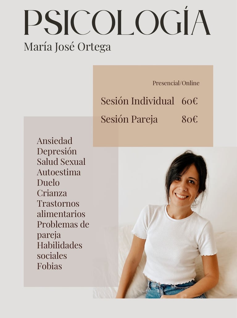 Soy María José Ortega (Col. CV18539), psicóloga general sanitaria con especialización en diferentes áreas.